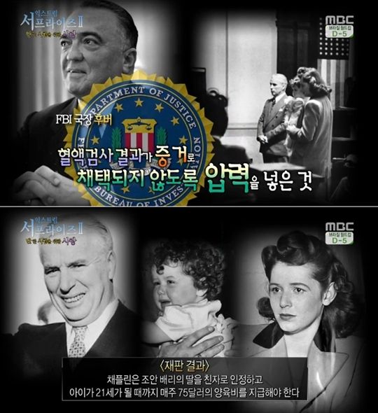 하지만 찰리 채플린을 공산주의자로 여긴 FBI 국장 후버는 혈액검사 결과가 증거로 채택되지 않도록 압력을 넣었다고 '서프라이즈'는 전했다. 결국 찰리 채플린은 조안 배리의 딸을 친자로 인정하고 아이가 21세가 될 때까지 매주 75달러의 양육비를 지급하라는 판결을 받았다.