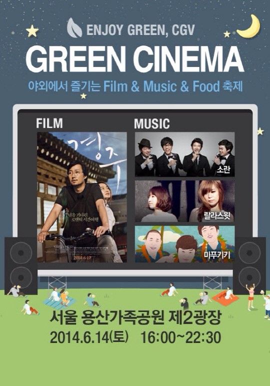 '그린 씨네마'는 CJ CGV가 오는 14일(토) 서울 용산 가족공원 제 2광장에서 개최하는 야외 페스티벌로, 음악 공연부터 최신 영화 관람까지 야외에서 모두 즐길 수 있도록 한 특별한 행사다.