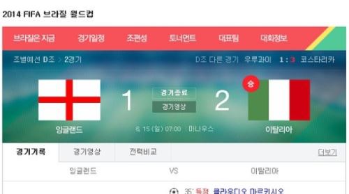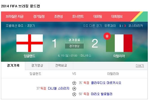 잉글랜드 이탈리아는 15일 (한국시간) 브라질 마나우스의 아레나 아마조니아 경기장에서 브라질 월드컵 D조 예선 첫 경기를 가졌다. 이날 이탈리아는 잉글랜드를 2-1로 이겼다.