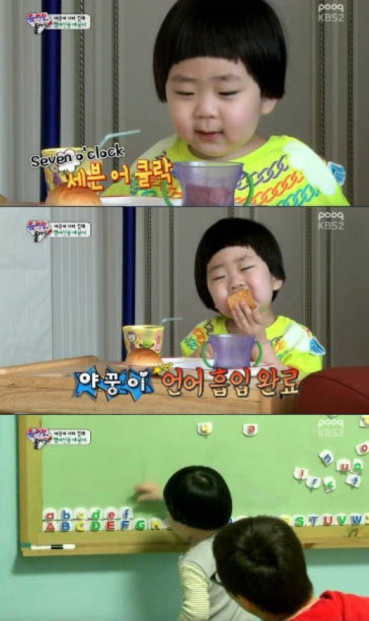 이날 방송에서 야꿍이는 밥을 먹다 자연스럽게 영어로 말을 하고, 알파벳을 순서대로 화이트 보드에 배열하는 등 영어실력을 뽐내 눈길을 끌었다.