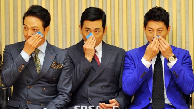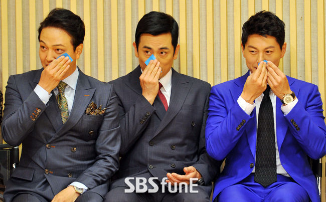 [SBS연예뉴스 | 김현철 기자] 배우 정웅인-차인표-류수영이 16일 오후 서울 목동 SBS에서 열린 '끝없는 사랑' 제작발표회에서 얼굴을 닦고 있다.