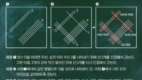 구구단 필요 없는 곱셈법은 곱셈을 덧셈으로 환원하는 원리를 이용한 것인데 해당 교차점의 개수에 따라 수를 더하면 결과가 나오는 것으로 밝혀졌다.