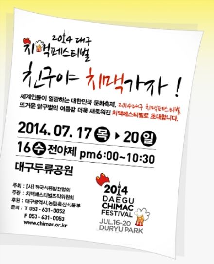 2014 대구 치맥페스티벌은 무료 입장이 가능하며 시식, 시음, 그리고 인기가수 공연 등을 즐길 수 있다. 오는 20일까지 진행되며 80개의 치킨 업체가 참여한다.