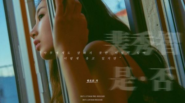 수지는 13일 자정 공식 SNS를 통해 17일 선공개되는 노래 '행복한 척'의 가사가 게재된 티저 이미지 2장을 추가로 선보였다. 수지는 이미 12일 가사 티저 이미지 2장을 공개한 바 있다.