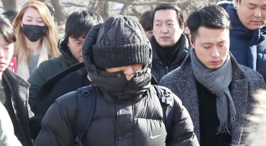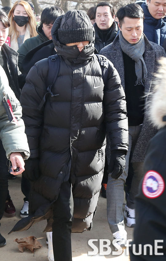 [SBSfunE 김현철기자]]빅뱅 탑이 9일 충남 논산시 연무읍 마산리 육군훈련소 입소 행사에 참석하고 있다.