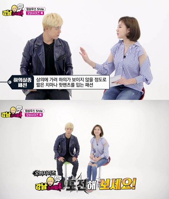 [ SBS연예뉴스 | 김재윤 선임기자] 오는 4월 1일 방송예정인 현대미디어계열 여성오락채널 트렌디(TRENDY)의 '강남 스타일' 3회에서는 MC 강남과 김정진이 패션 트렌드를 주릅잡고 있는 '오버사이즈 룩'에 대해 알아본다.