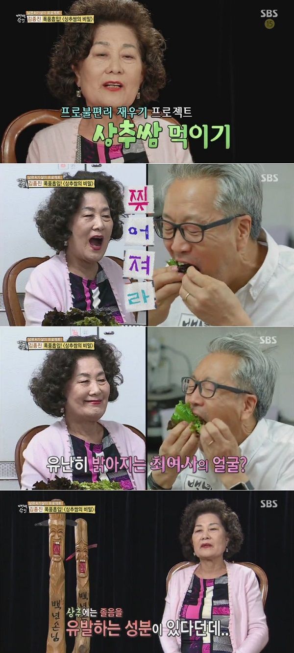 장모는 갈비찜, 청국장 등 푸짐한 음식을 대접하며 졸음을 유도한다는 상추를 식탁 한가득 준비했다. 잠을 재우고 싶어 하는 장모의 속마음도 모른 채 입안 가득 쌈을 먹는 김종진의 '상추쌈 먹방' 장면은 순간 최고 시청률인 7.7%까지 치솟았다.