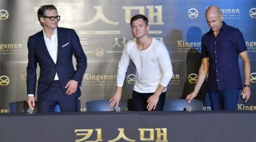 [SBSfunE 김현철기자]배우 콜린 퍼스-테런 에저트-마크 스트롱이 21일 오전 서울 용산CGV에서 열린 영화 '킹스맨 : 골드서클' 내한 기자회견에 입장을 하고 있다.