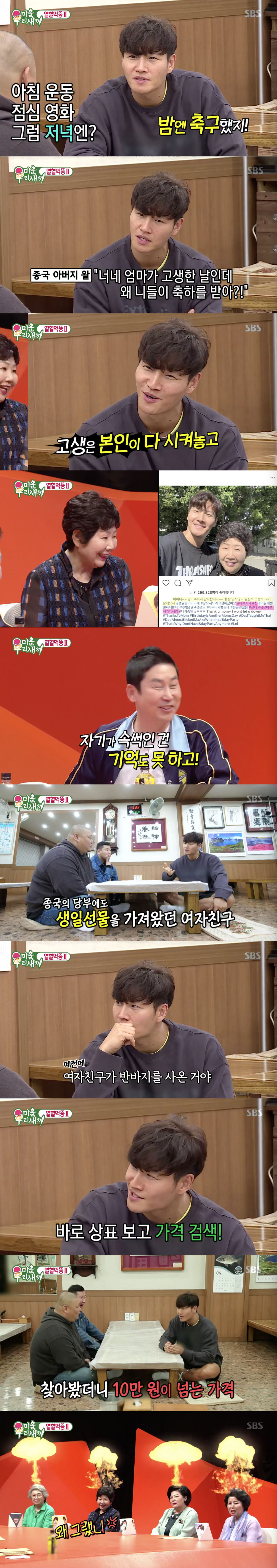 그리고 김종국은 과거 여자 친구와의 일화도 공개했다. 그는 "과거에 여자 친구한테 생일선물을 하지 말라고 했었다 절대로. 그렇게 하지 말라고 했는데 선물을 한번 갖고 온 적이 있다. 그래서 선물을 보자마자 아버지 갖다 드리라고 줬다"라고 했다.