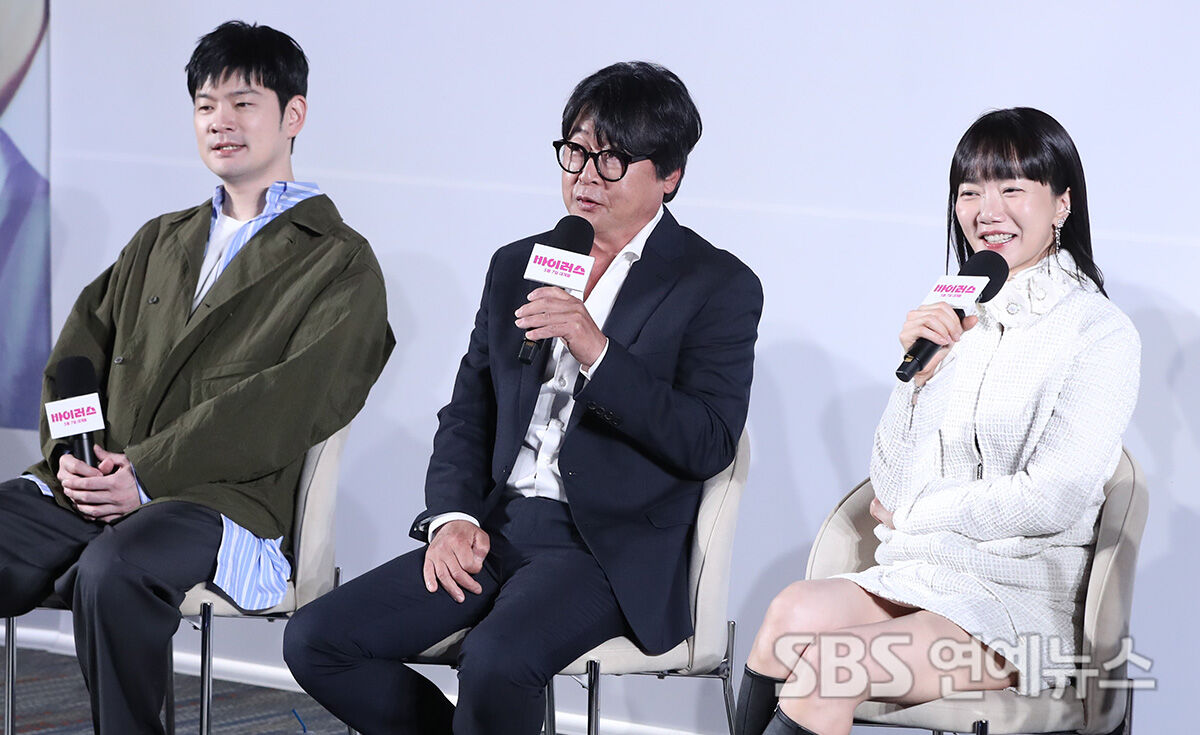 [SBS연예뉴스 | 백승철 기자] 배우 장기하(왼쪽부터), 김윤석, 배두나가 16일 오전 서울 강남구 메가박스 코엑스에서 열린 영화 '바이러스' 제작보고회에 참석해 토크 시간을 갖고 있다.