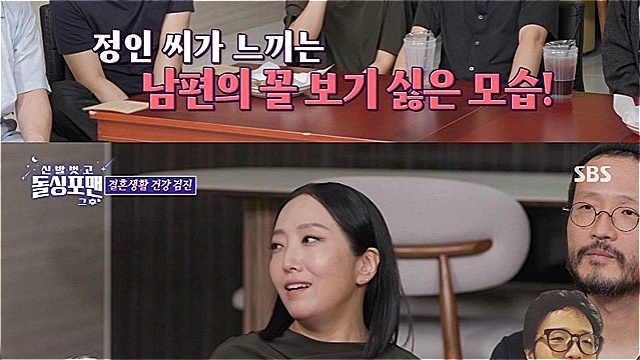 정인은 남편의 꼴 보기 싫은 스타일이 무엇이냐는 질문에 "사실 예전에는 야리야리한 스타일을 좋아했다. 사연 있어 보이고 그래서 좋아했다. 그런데 결혼해서 살아보니 힘들더라"라고 솔직하게 말했다.