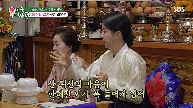 한혜진의 결혼운에 대해 무당은 "결혼할 사람이 있었다"라며 말문을 열었다. 이어 그는 "이 나라가 아니야. 외국에 잠시 계셨을 때 그랬나, 장거리 연애를 네가 그렇게 했느냐"라고 했다.