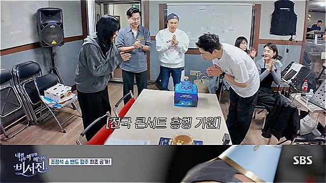 이후 비서진은 조정석 밴드에게 피자와 음료를 수발하고 콘서트 대박을 기원하는 케이크도 준비해 조정석을 감동받게 했다.