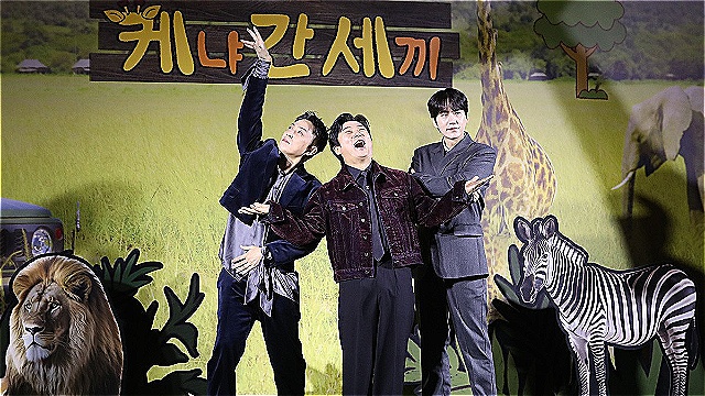 [SBS연예뉴스 | 백승철 기자] 은지원(왼쪽부터), 이수근, 규현이 25일 오전 서울 용산구 CGV용산아이파크몰에서 열린 넷플릭스 예능 '케냐 간 세끼' 제작발표회에 참석해 포토타임을 갖고 있다.