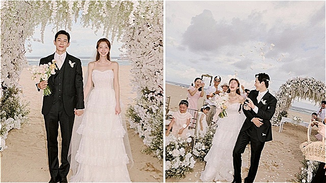 온주완♥방민아, 발리서 영화 같은 결혼식…하얀 꽃 아래 선남선녀