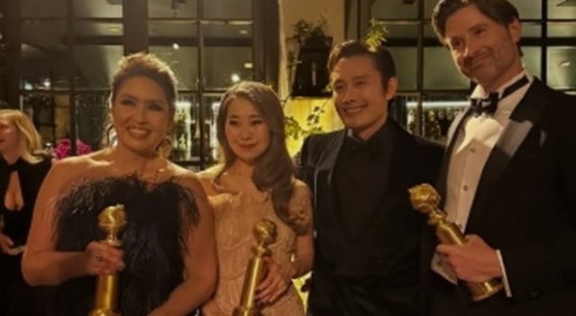 美 골든글로브 간 이병헌, 무관 아쉬움 달랜 '케데헌' 수상…화기애애 단체샷