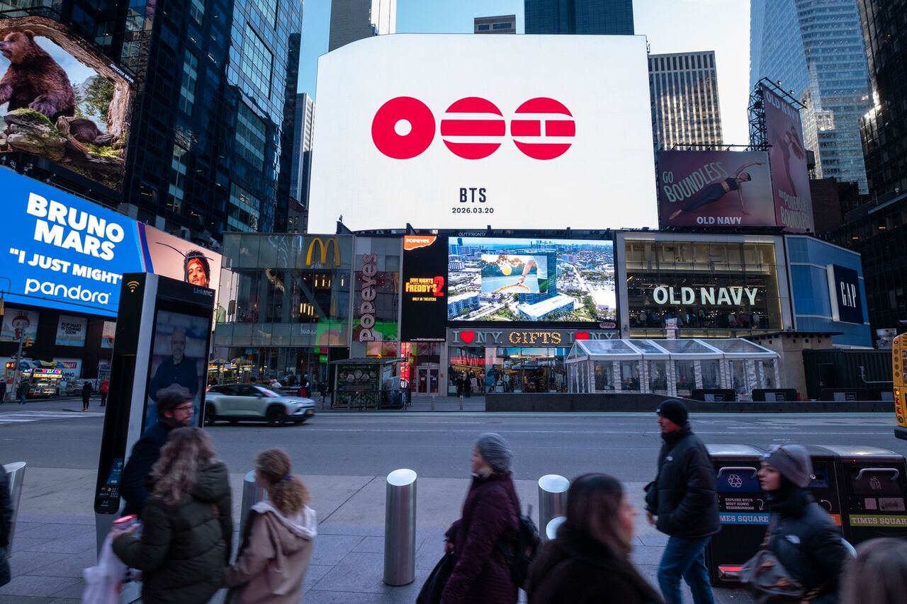 방탄소년단은 월드투어에 앞서 3월 20일 다섯 번째 정규 앨범을 발매한다. 완전체로 약 3년 9개월 만의 신보다. 컴백 분위기는 전 세계 곳곳에서 감지되고 있다. 뉴욕, 도쿄, 런던, 파리 등에서 신보 로고를 활용한 옥외 광고가 진행되고 있다. 서울 광화문 광장 인근 세종문화회관에서 시작된 프로모션이 전 세계 주요 도시로 확산됐다. 대형 전광판을 채운 로고는 SNS에서 빠르게 공유되며 세계인의 이목을 집중시키고 있다.