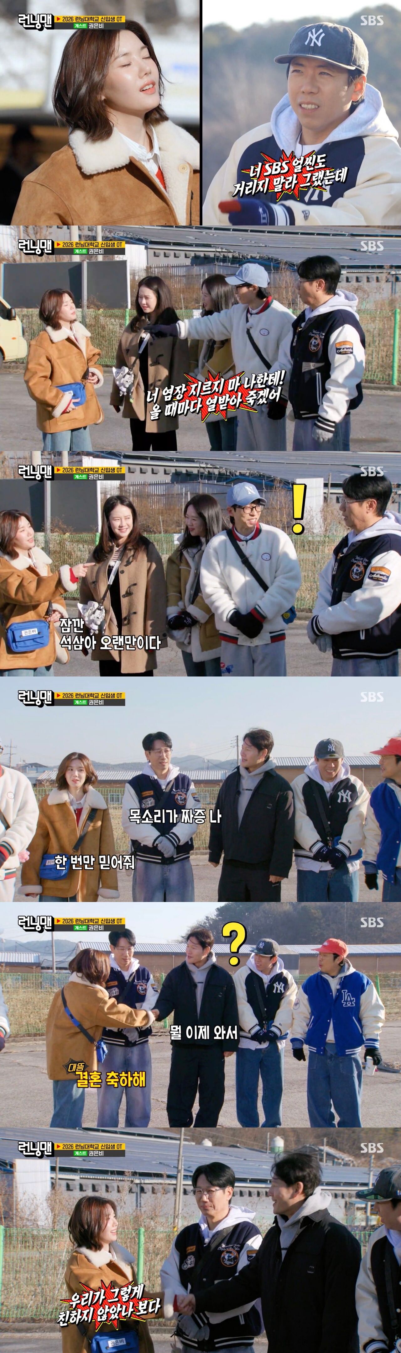 이에 억울해하던 권은비는 대뜸 김종국에게 "결혼 축하해"라며 인사를 건넸다. 그러자 김종국은 "뭘 이제 와서. 그동안 우리가 그렇게 못 봤나"라고 겸연쩍어했다. 이에 권은비는 "우리가 그렇게 친하지 않았나 보다"라며 너스레를 떨었다.
