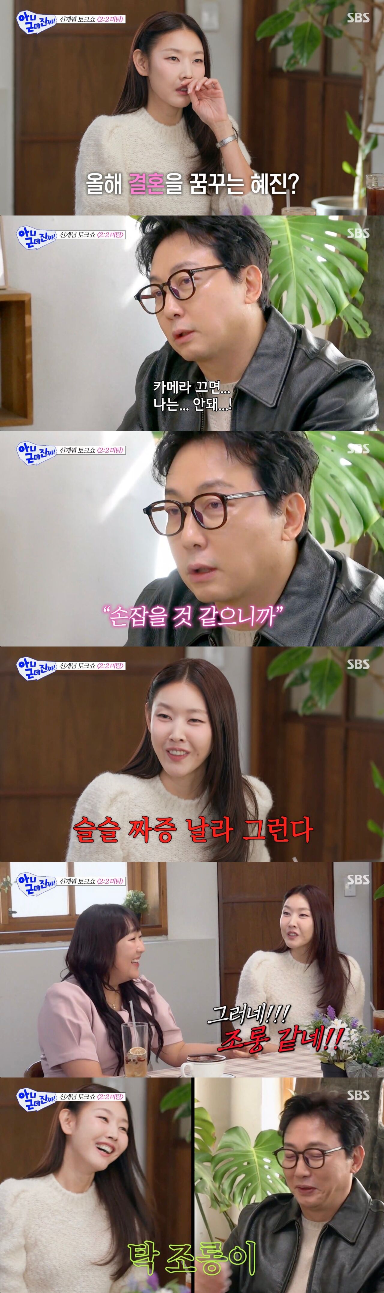 탁재훈은 "카메라 끄면 안 돼. 나 손 잡을 거 같으니까"라고 너스레를 떨었다. 이에 이상민은 "한혜진의 단점을 듣고도 손 잡고 싶어 진다면 말리지 않겠다"라고 했다. 그러자 탁재훈은 "제발 싫어져라 싫어져라"라며 기도를 해 눈길을 끌었다.