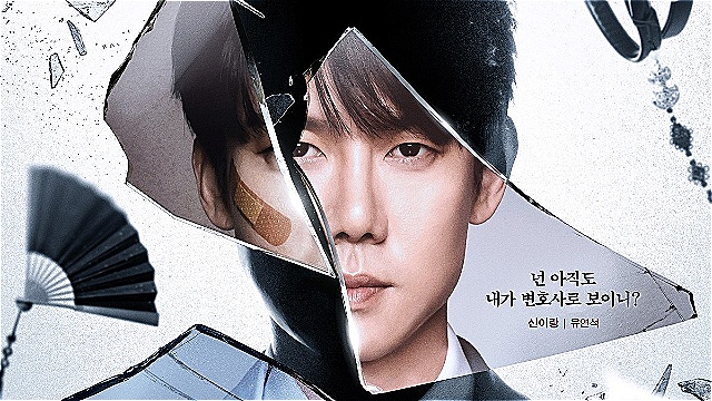 먼저, 신이랑의 포스터에는 "넌 아직도 내가 변호사로 보이니?"라는 문장이 강렬하게 각인된다. 단정한 슈트 차림의 변호사 얼굴 위로 금이 가기 시작하고, 그 틈 사이로 또 다른 모습들이 스며든다. 볼에 붙은 반창고, 정장이 아닌 가운, 오른쪽 가슴에 달린 아이돌 배지, 무당을 연상시키는 넥타이와 부채까지, 서로 어울릴 것 같지 않은 이미지들이 한 인물 안에서 공존한다. 망자의 한을 듣고, 때로는 빙의되기도 하는 인물의 특성이 파편처럼 흩어져 드러난 것. 일상과 법정에서 예측불가한 돌발 행동을 보이게 되는 이유 역시 이 균열 속에 있다.