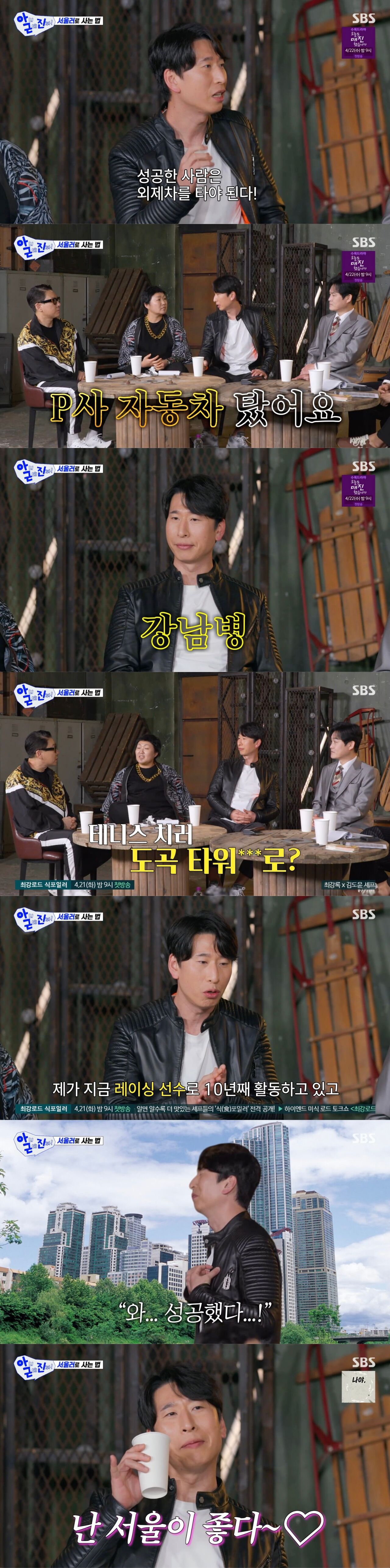 이어 양상국은 "시골 사람들이 성공했다고 무의식적으로 느낄 때가 있다. 나 같은 경우에는 도곡동에 주차를 하고 트렁크를 열어서 테니스 가방을 메고 테니스장을 향해 걸어 들어가면 등 뒤에 타워팰리스가 있다. 그때 "와 성공했다"하고 느끼곤 한다. 그냥 별거 아니잖냐. 그런데 성공했다는 느낌이 들더라"라고 말해 웃음을 자아냈다.