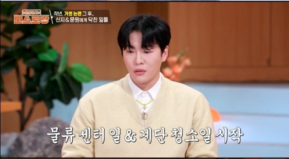 이에 문원은 "제가 할 수 있는 걸 찾다가, 물류센터에서 물건을 옮기거나, 계단청소 업체에서 일했다"며 "손 놓고 쉴 수는 없어서 보탬이 되고자 했다"라고 말했다.