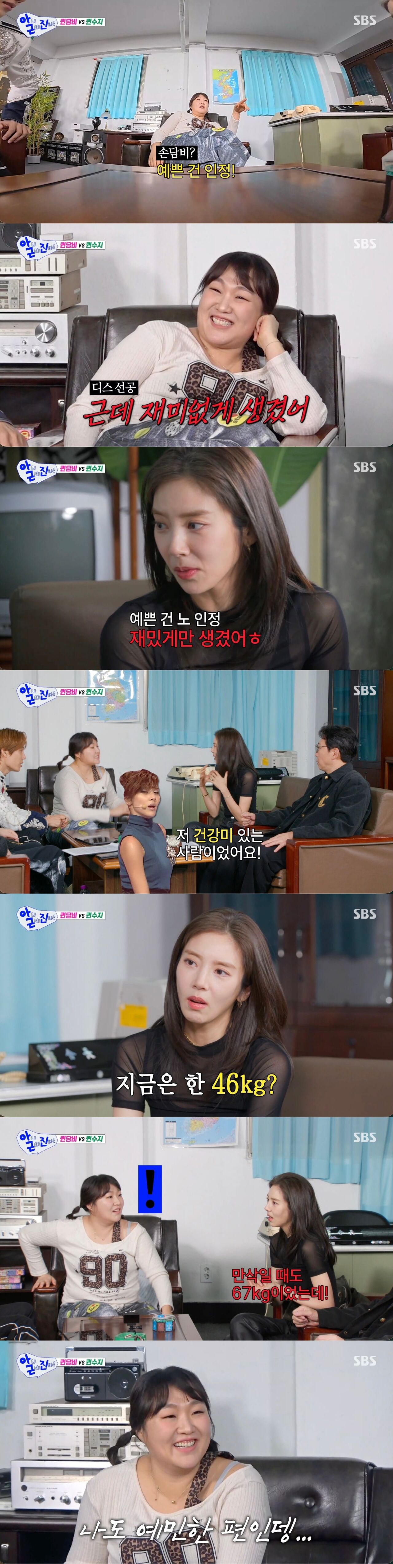 그러자 손담비는 "예쁜 건 노인정, 재밌게만 생겼어"라고 응수해 이수지를 분노하게 만들었다.